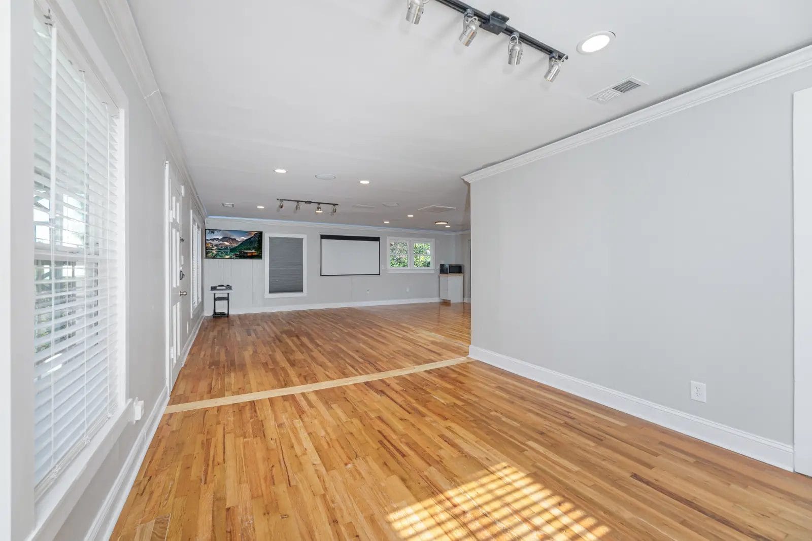 As soon as you step foot inside, your eyes will be drawn to the bright, open room, which is bathed in natural light from the many large windows that span its length. The red oak hardwood floor is another striking feature. The indoor space can accommodate as many as 65+ seated guests and even more standing.