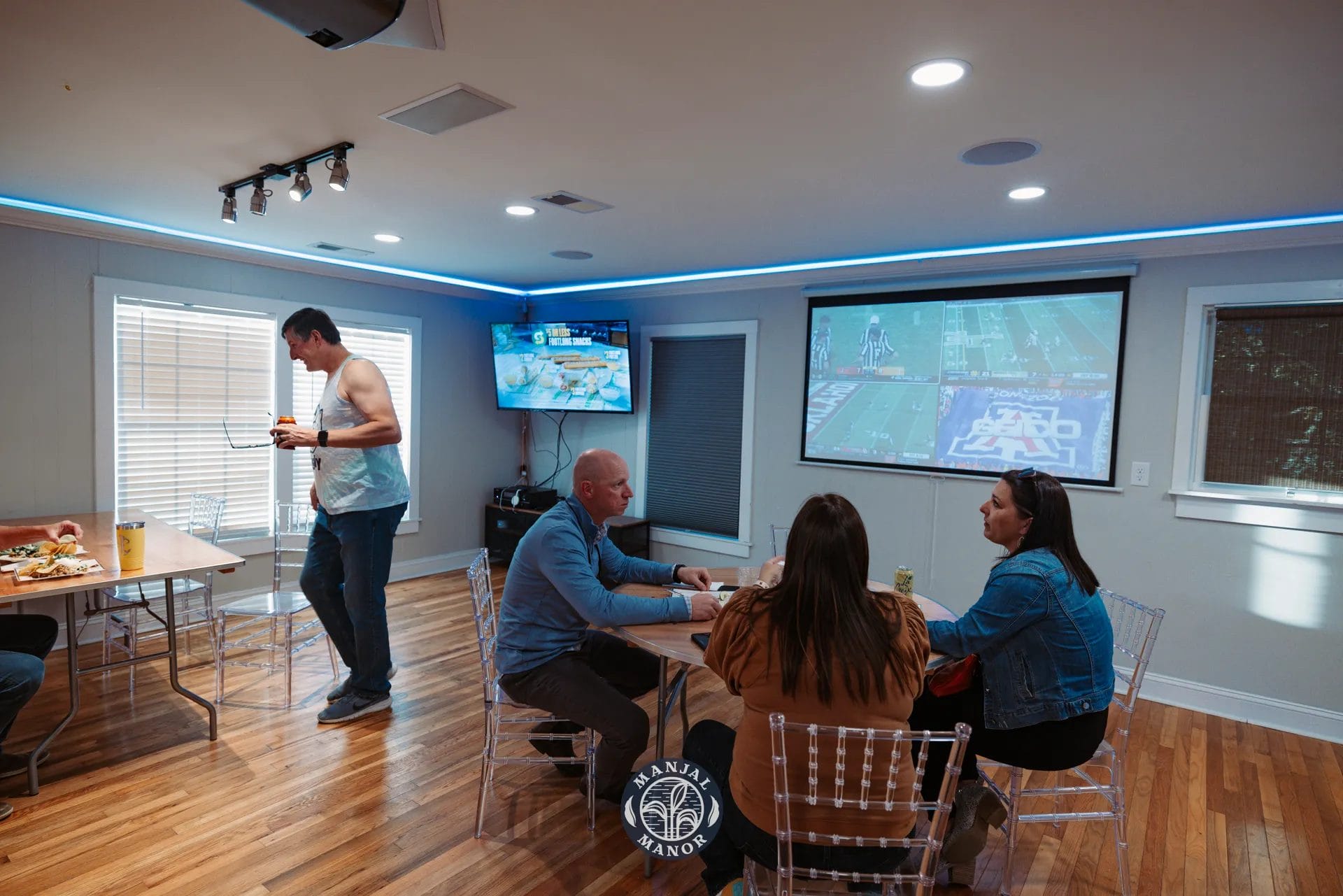 At our venue, Ron’s friends were able to catch the football game on our indoor projector while still enjoying the celebration. We offer both a smart TV and a projector, allowing guests to easily connect their own devices using our HDMI splitter for live TV streaming. With the arrival of winter, we’ve also added a Solo Stove fire pit, which brought extra warmth and a cozy atmosphere to the event.